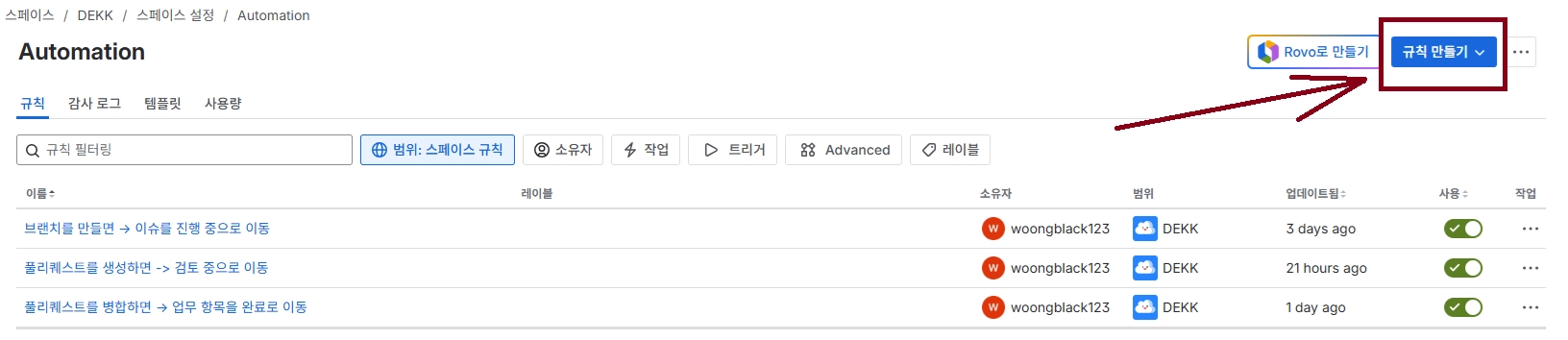 프로젝트 설정 > 자동화에서을 등록하세요.