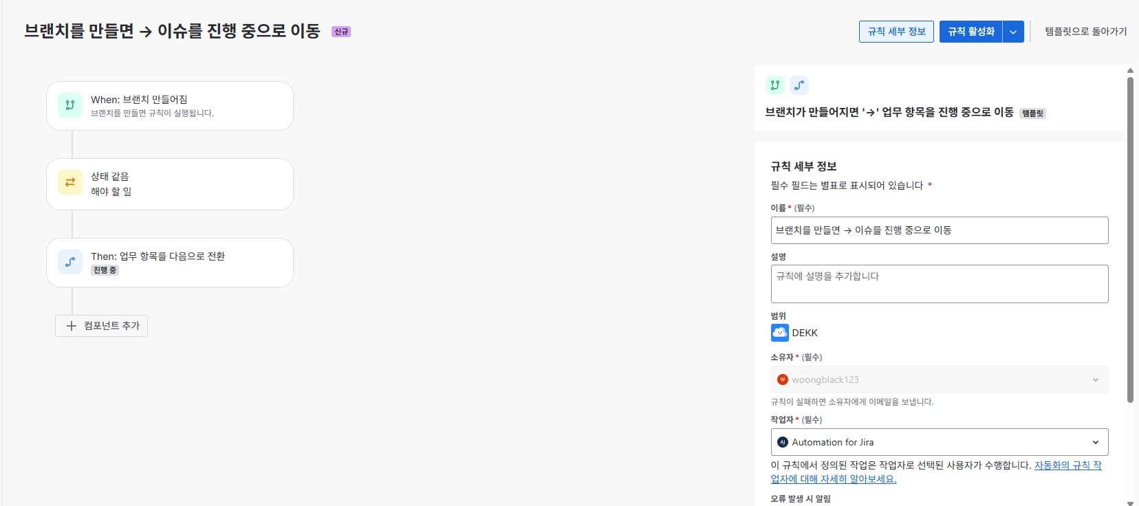 - 권한 연결: Jira와 팀의 GitHub 레포지토리(DK 프로젝트 관련) 연결 승인 (관리자만 가능)