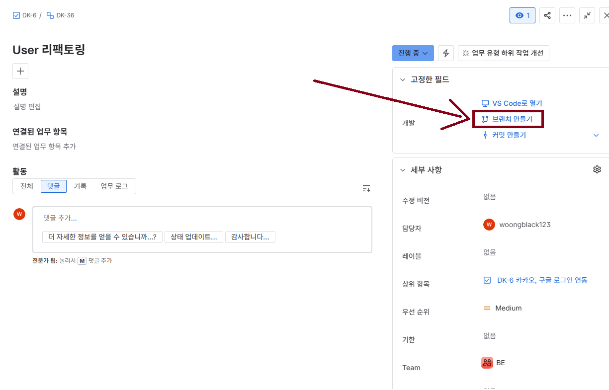 DK-12) 상세 페이지로 들어갑니다. - 우측 개발(Development) 섹션에 있는 [브랜치 만들기(Create branch)] 링크를 클릭합니다.