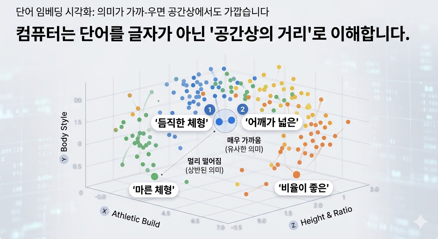 - 효과: ‘듬직한’과 ‘어깨가 넓은’은 글자는 달라도 의미가 비슷하므로 지도상에서 아주 가까운 거리에 좌표가 찍힙니다. 컴퓨터는 이 거리를 계산하여 문맥을 이해합니다.