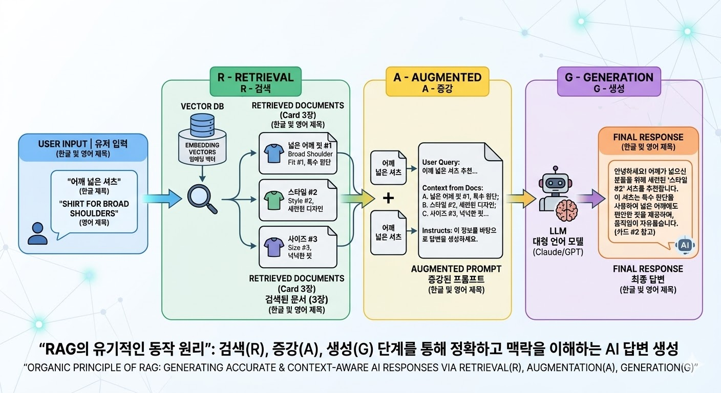 (시스템 내부 프롬프트: “유저가 어깨 넓은 체형의 셔츠를 찾네. 참고로 우리 DB에서 찾은 추천 후보는 A, B, C야. 특징은 이러이러해. 이 자료를 바탕으로(증강) 대답해 줘.”)